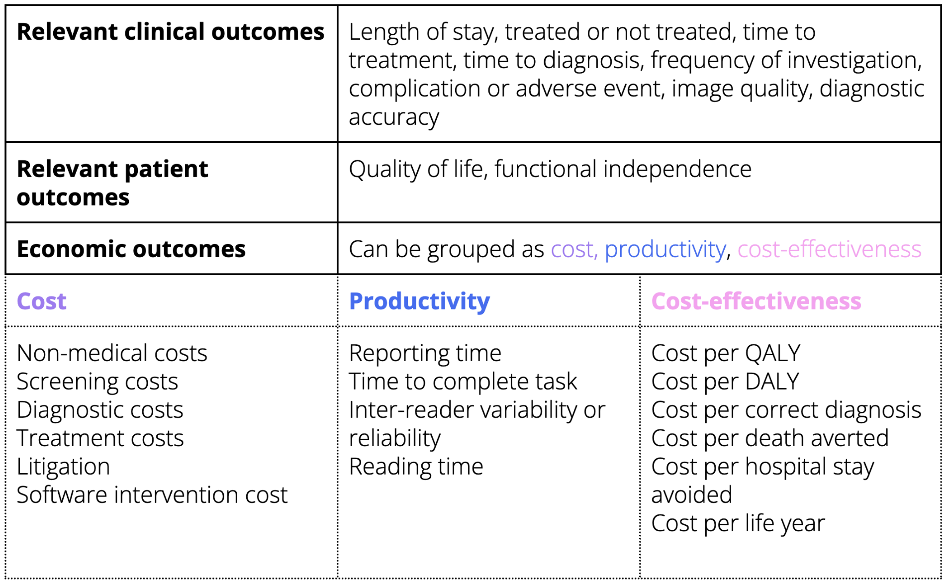 If you are building a device that is diagnosing or supporting diagnosis, you can use the clinical and economic outcome metrics highlighted in our review as a foundation for your evidence generation journey. For those operating in radiology, consider the productivity outcomes also. To take this one step further, you could make the list of outcomes and metrics specific to an imaging modality and market. Using our data extraction table in Appendix 6 of the publication, it will allow you to quickly focus on outcomes listed for relevant studies e.g. AI for CT scans in the UK. This is the initial step for an optimal assessment of your device’s economic value.