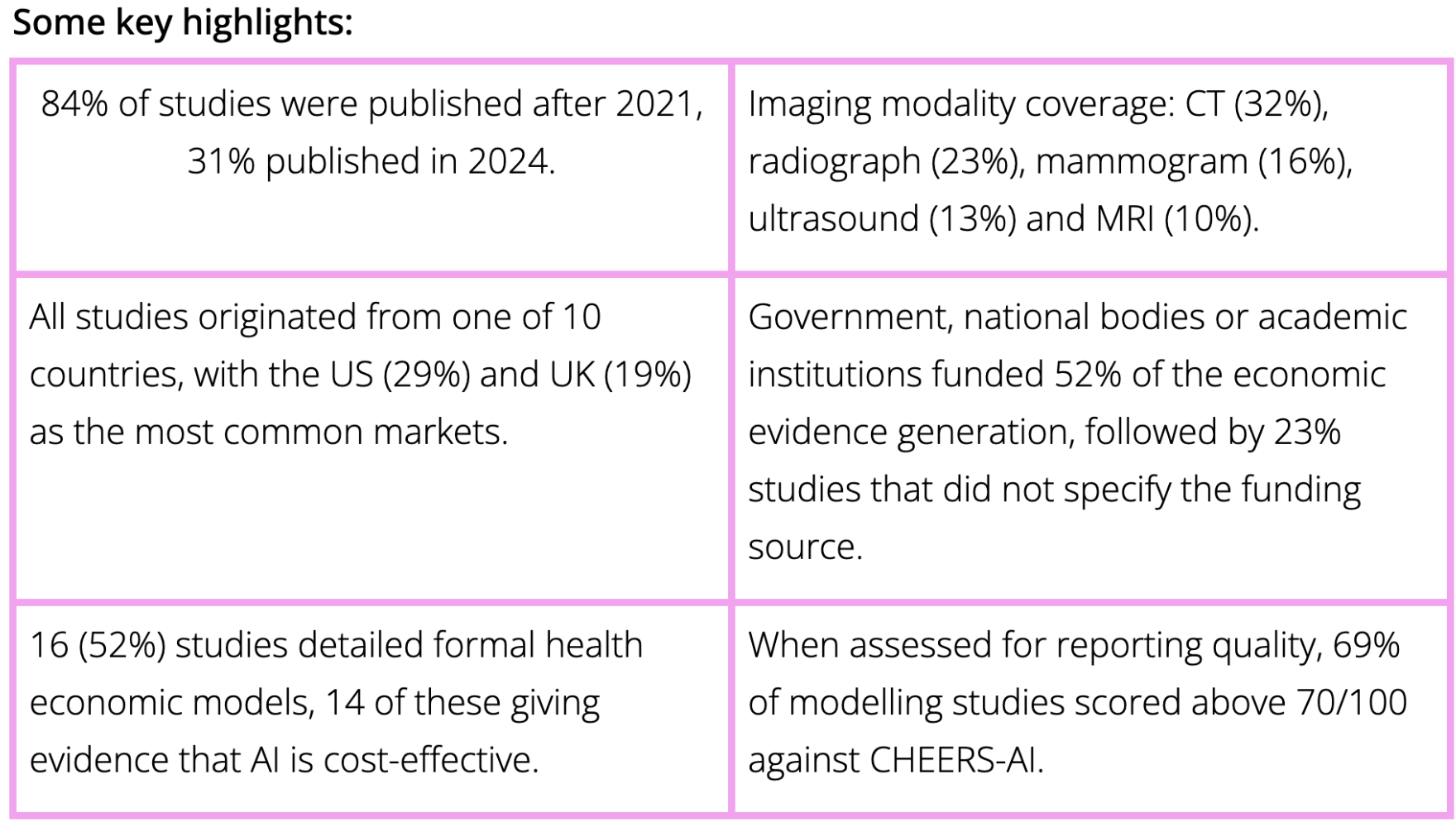 We critically appraised the existing evidence on economic evaluations of radiology AI. The full methods of our review can be read in the publication here.